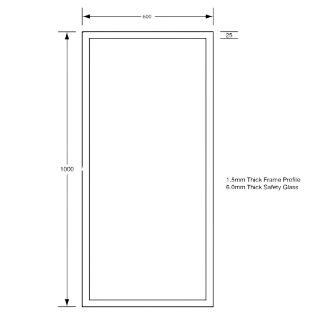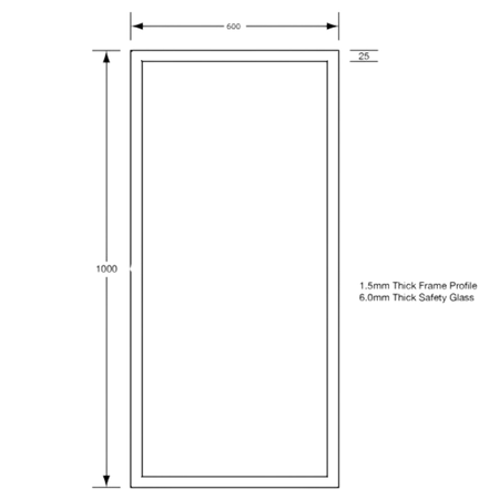 Dimensions: 1000mmH x 600mmW x 25mmD