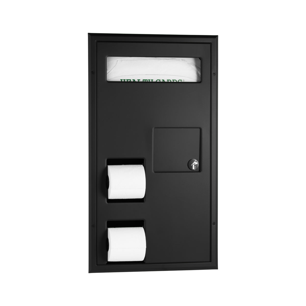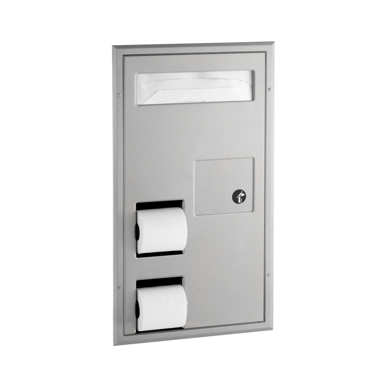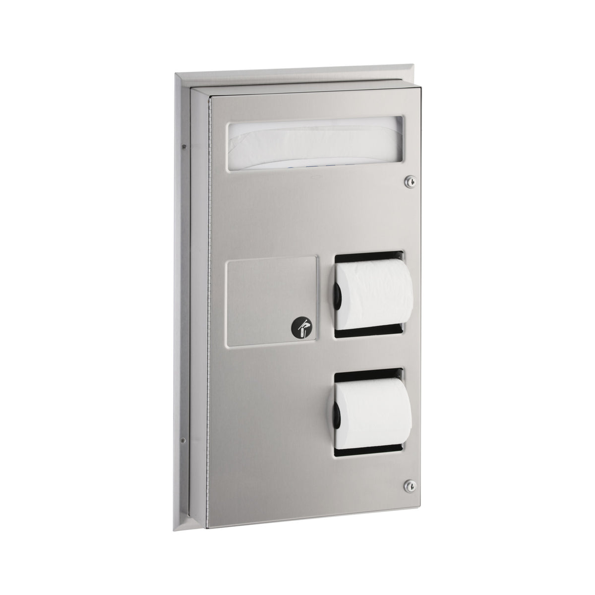 Type-304 stainless steel with all welded construction; exposed surfaces shall have satin finish. Mounts centered through toilet partition. Used from both sides, serviced from one side. Capacity: 0.8-gal. (3.0-L). Door unlocks with key provided and swings open for filling. Holds two standard core tissue rolls and 500 toilet seat covers for each compartment (1000 total). Theft-resistant spindles. Rough Partition Opening: 15 1/2″ W, 28 7/8″ H (395 x 735mm).