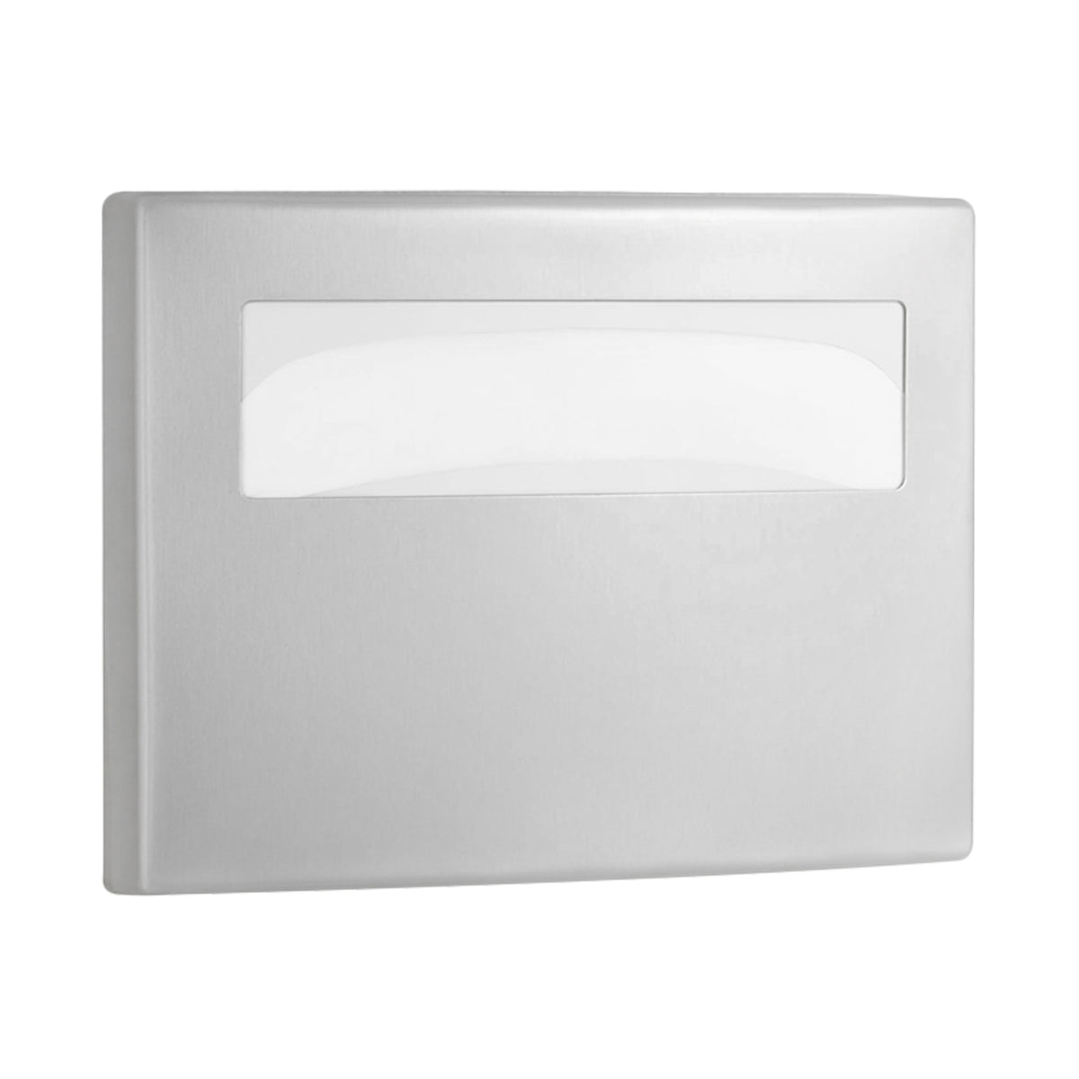 Satin-finish stainless steel. Dispenses 250 single- or half-fold toilet seat covers or one box. Fills from bottom. Unit 15 3/4″ W, 11″ H, 2″ D (400 x 280 x 50mm). Allow 5″ (125mm) minimum clearance from bottom of dispenser to top of any horizontal projection for filling dispenser from below unit.