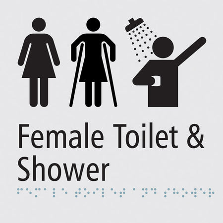 - Braille reads “Female Toilet Ambulant & Shower Sign”