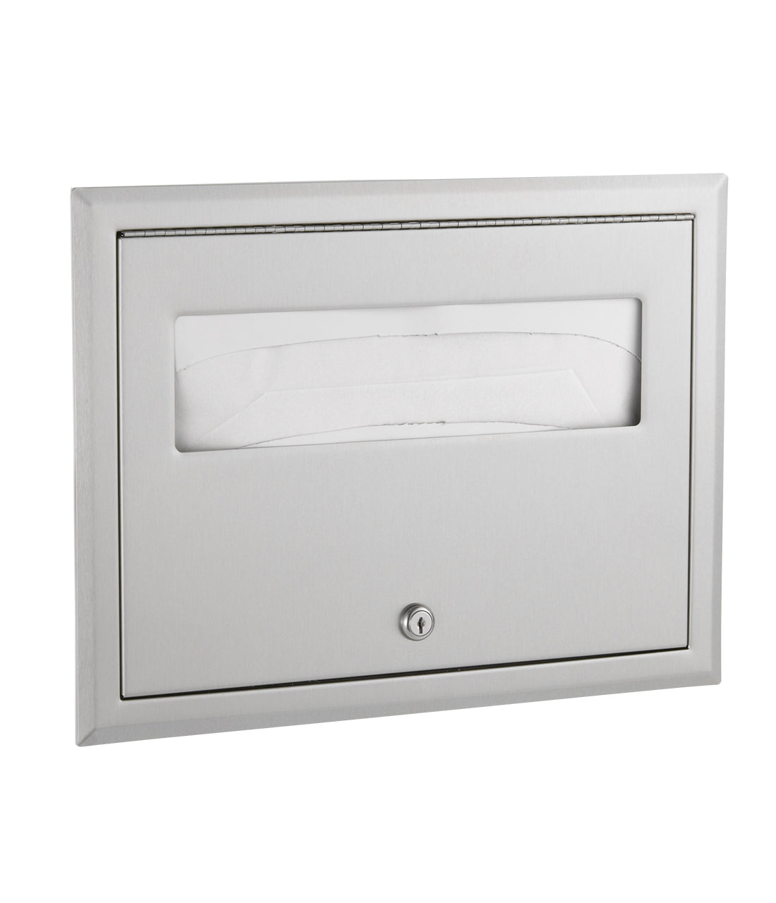 Satin-finish stainless steel. Seamless beveled flange. Dispenses 500 toilet seat covers. Rough Wall Opening: 15 5/8″ W, 11″ H, 2 5/8″ min. depth (395 x 285 x 67mm).