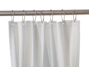 Vinyl shower curtains - opaque, matte white vinyl, .008″ (0.2mm) thick, contains antibacterial and flame retardant agents. White HDPE grommets along top, one every 6″ (150mm). Hemmed bottom and sides, requires 7 hooks (not included).